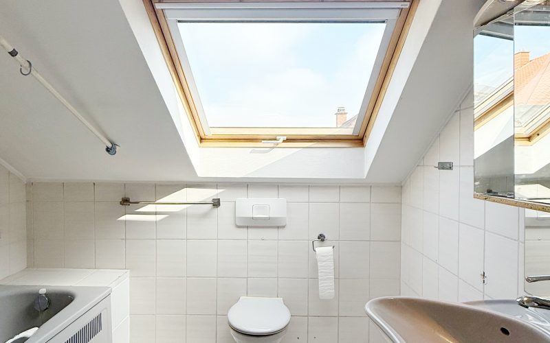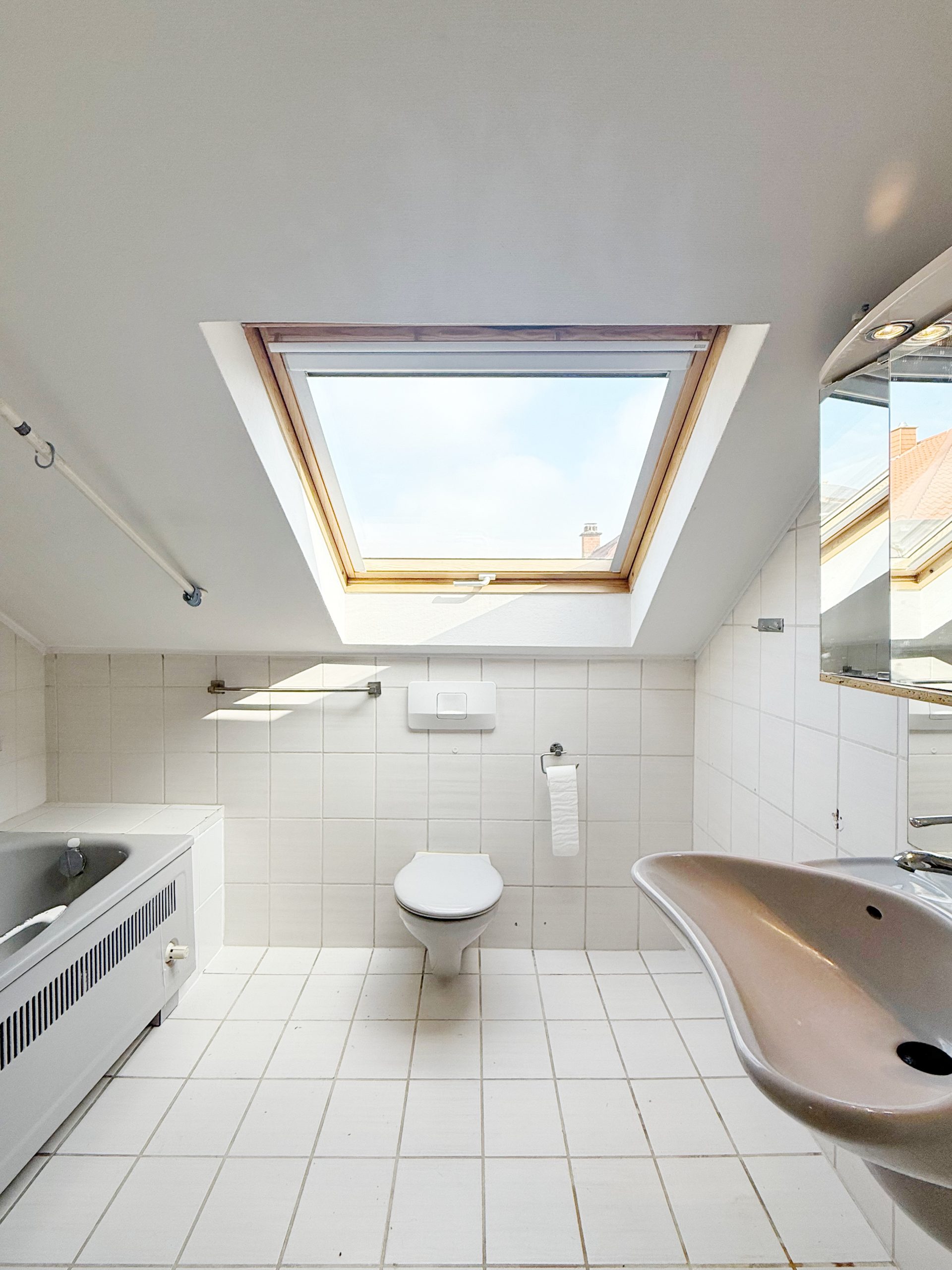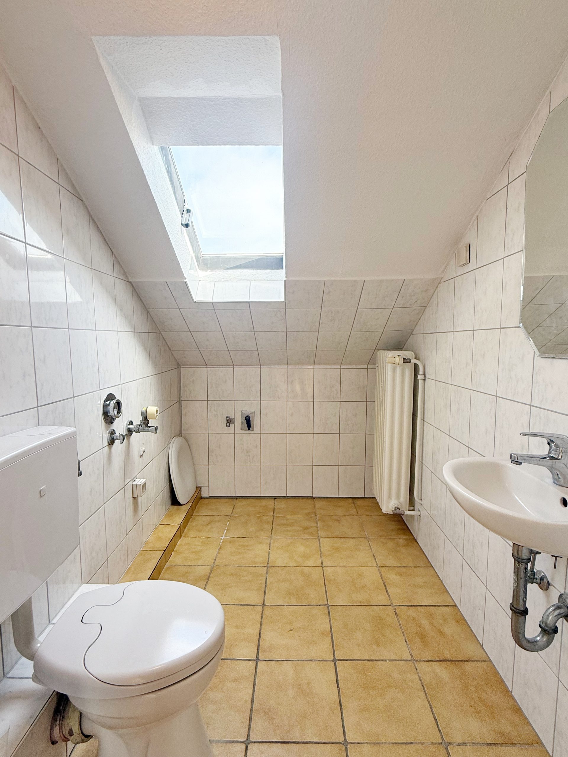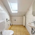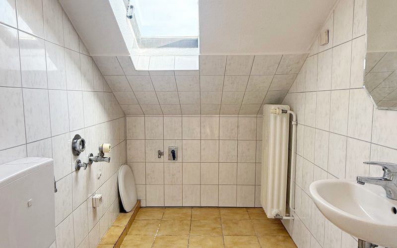 Das Badezimmer ist modern mit weißen Fliesen gestaltet und bietet eine Badewanne sowie ausreichend Platz für Ihre Badeinrichtung. Ergänzt wird das Raumangebot durch ein separates Gäste-WC.