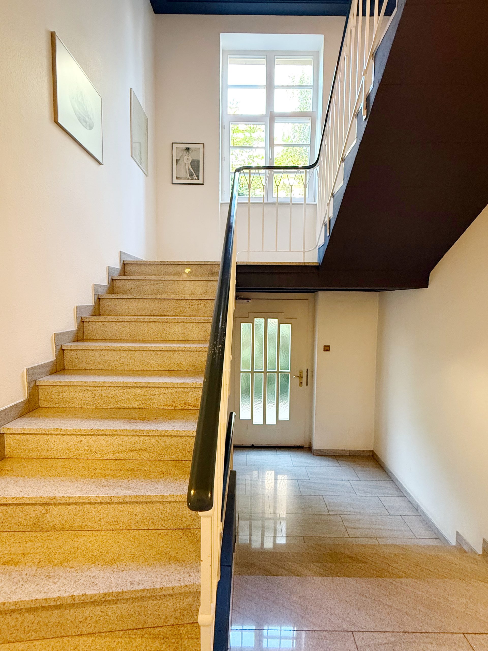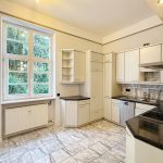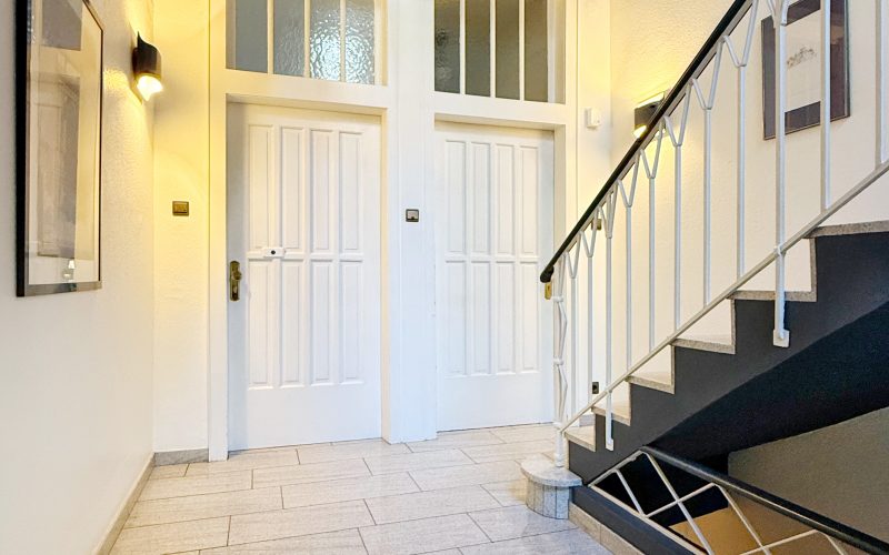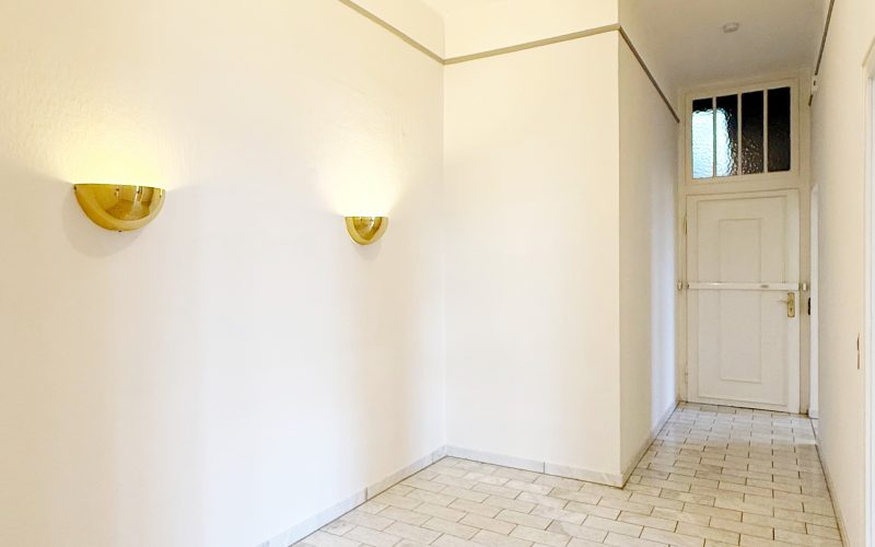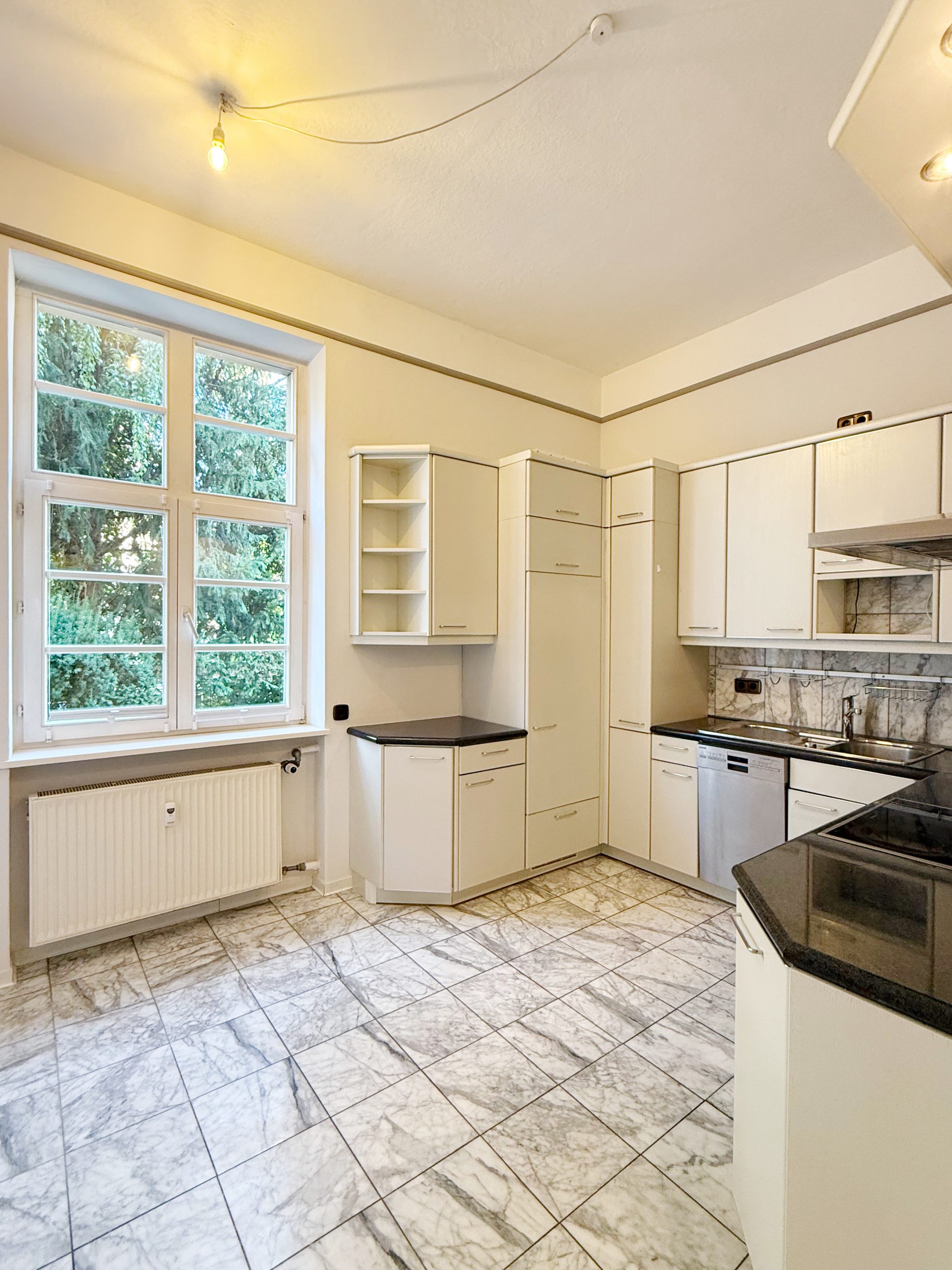 Bereits die geräumige Diele mit edlem Marmorboden vermittelt einen einladenden ersten Eindruck und bietet Zugang zu allen Räumen. Linker Hand befindet sich die Küche, ausgestattet mit einer hochwertigen Alno-Einbauküche, Marmorboden sowie passendem Fliesenspiegel. Angrenzend erreichen Sie das helle Tageslichtbad, das mit einer Eckbadewanne, WC, Waschbecken samt Unterschrank und Spiegelschrank komfortabel ausgestattet ist.