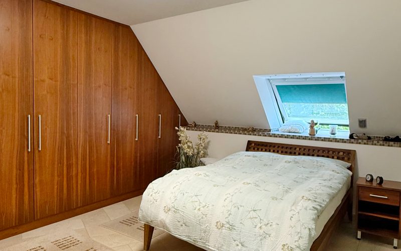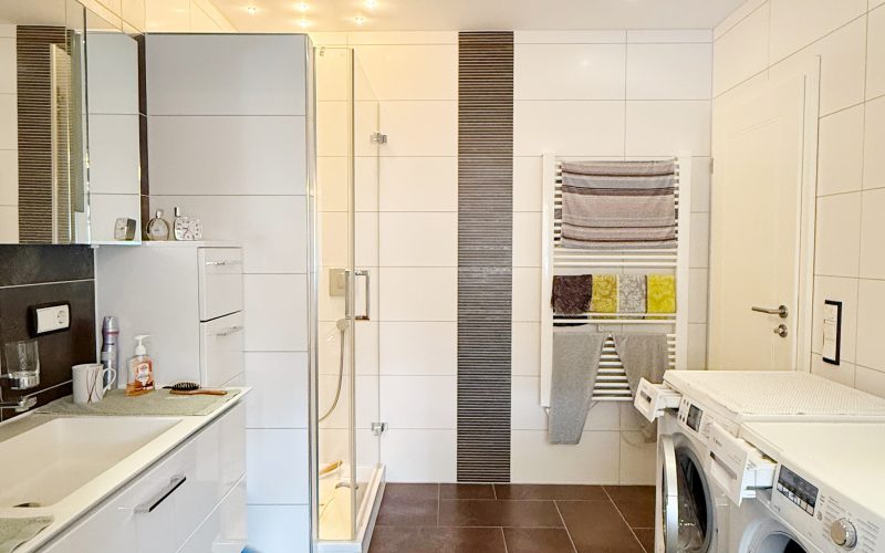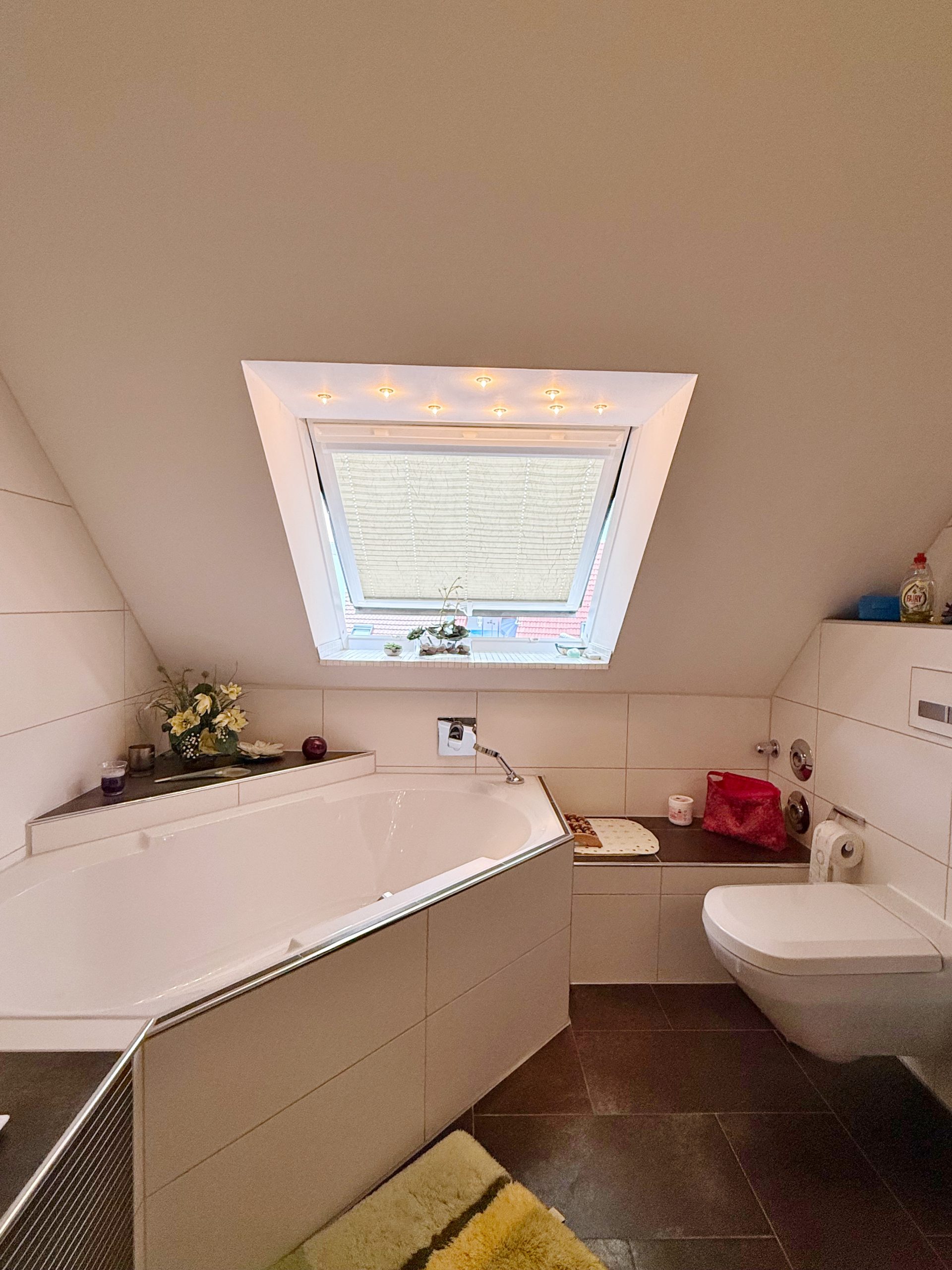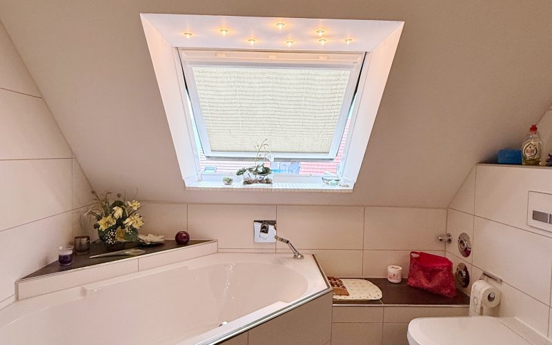Angrenzend an die Küche befindet sich das geräumige Schlafzimmer sowie das attraktive Tageslichtbad mit einer Eckbadewanne und einer separaten Dusche. Ein zusätzlicher Abstellraum innerhalb der Wohnung bietet praktischen Stauraum.